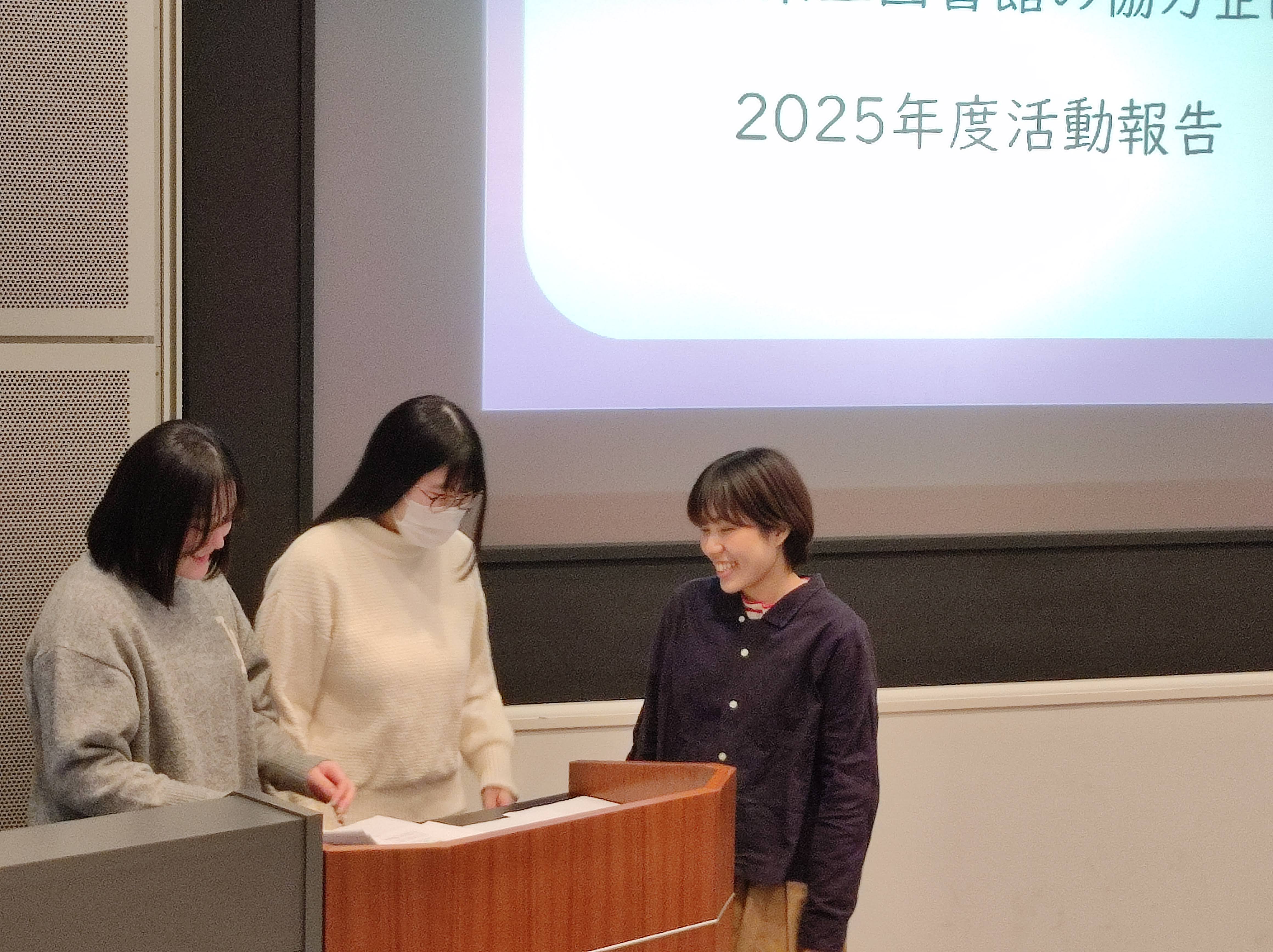 2/6(金)の午後に、岡山県立図書館2階にあるデジタル情報シアターにて、情報デザイン学科と岡山県立図書館の協力活動で2025年度に行った活動を報告する、活動報告会を行いました。