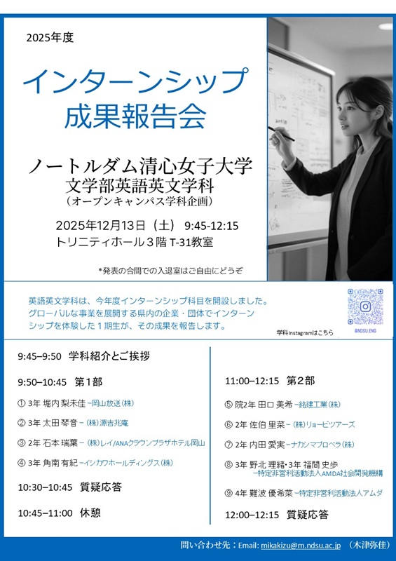 2025年12月13日(土)オープンキャンパスにおいて、英語英文学科企画「インターンシップ成果報告会」を開催します。