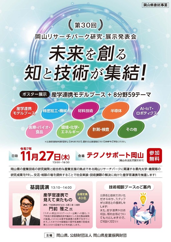 岡山県の産業技術と研究成果が一堂に会する 「第30回 岡山リサーチパーク研究・展示発表会」 が開催されます。