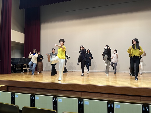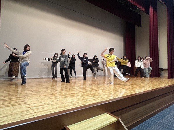 演舞鑑賞の後には、王先生による体験コーナーも設けられ、学生たちは中国語の掛け声に合わせて動きを真似しながら、実際に太極拳を体験しました。