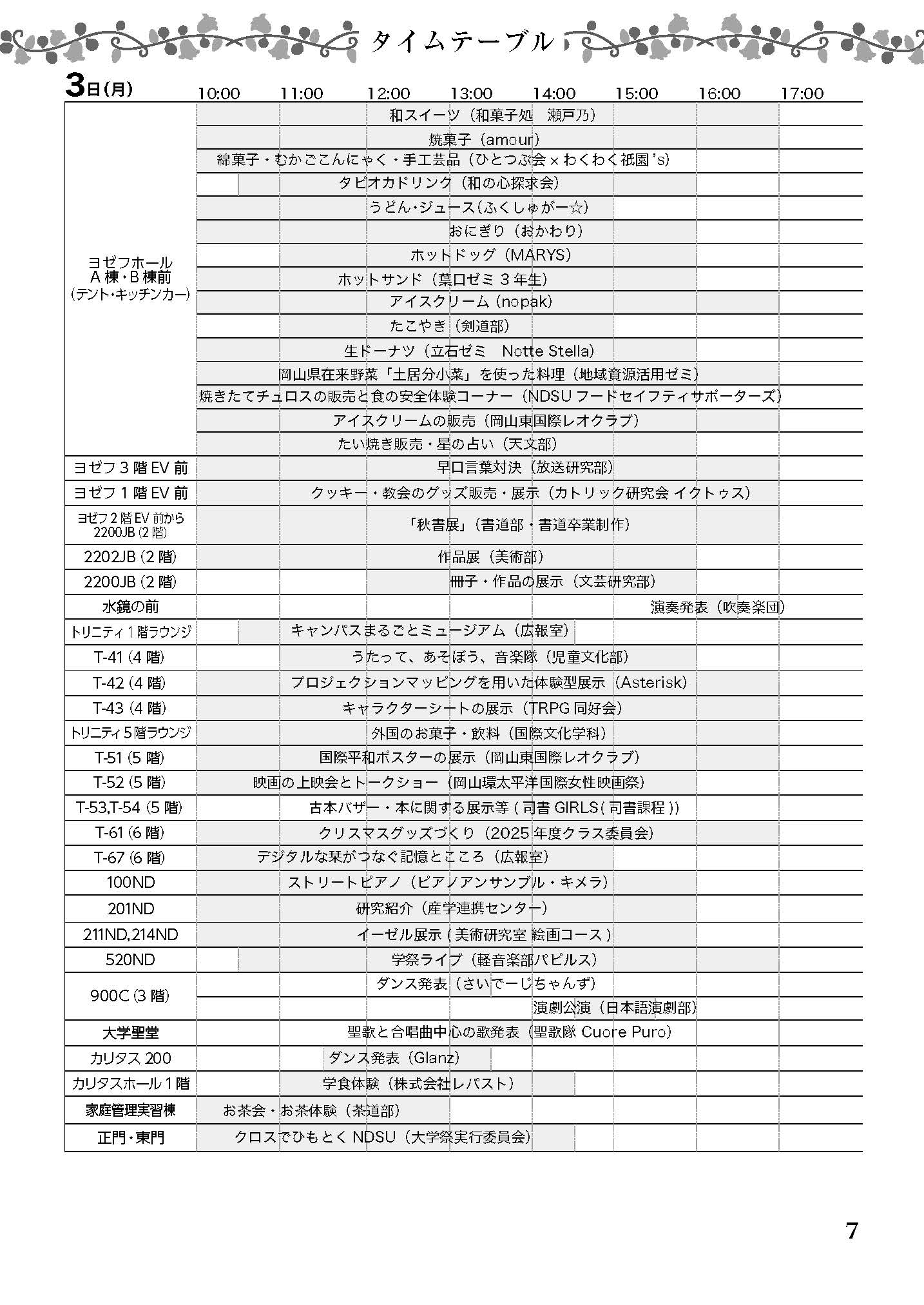 amour、ボランティアサークルひとつぶ会、和の心探求会、ふくしゅがー☆、国際文化学科 페 빛나는 섬 / Cafe Isla Hermosa、おかわり、MARYS、葉口ゼミ3年生、nopak、剣道部、立石ゼミ Notte Stella、地域資源活用ゼミ、ぽぽん7、茶道部、NDSU フードセイフティサポーターズ、放送研究部、カトリック研究会イクトゥス、岡山東国際レオクラブ、天文部、ハンドベル部、MilkyFields、さいでーじちゃんず、Glanz(グランツ/ダンスサークル)、聖歌隊、日本語演劇部、吹奏楽団、箏曲部、児童文化部、軽音楽部パピルス、文芸研究部、書道部、路上観察倶楽部、TRPG 同好会、美術研究室、産学連携センター、司書課程、書道卒業制作、美術部、Asterisk、広報室、清心子育てプロジェクト、岡山環太平洋国際女性映画祭、2025年度クラス委員会、英語教育センター、入試広報部、株式会社レパスト