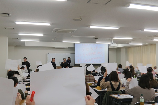 また、第2部では、ファシリテーターに石原達也氏(岡山NPOセンター前代表理事)を迎え、パネルディスカッションを行いました。人間生活学科社会福祉士課程3年生による発表を行った後、テーマに沿って参加者が回答、また、周囲の人と意見交換をしながら、考えを深めていきました。
