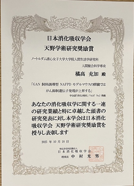 橘髙さんの受賞は、日本消化吸収学会誌“消化と吸収”第47巻第2号に公表された「GAN飼料誘導型NAFPDモデルマウスの膵臓ではがん抑制遺伝子発現が上昇する」と題する研究論文が評価され与えられものです。