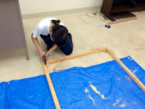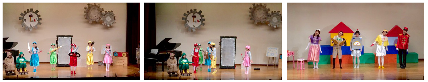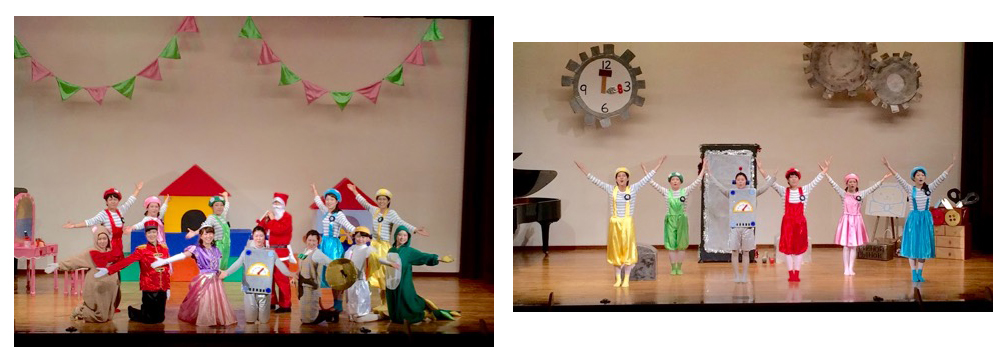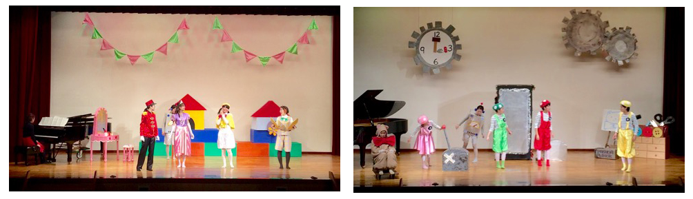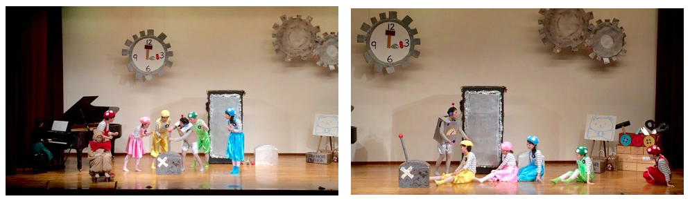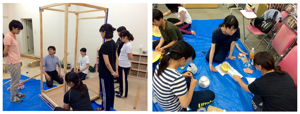 夏休みまでに台本、作詩・作曲、大道具・衣装などのデザインを決定します。そして、夏休みに入ると、岡本直行先生(新見公立短期大学准教授)をお招きしてのご指導も受けながら、大道具制作に取り掛かり、同時進行で小道具、衣装制作も行われます。音楽研究室は、演奏だけしているイメージがあるかもしれませんが、電動ドリル、のこぎり、トンカチからミシンまで器用に何でも使いこなし、舞台に関わることすべて研究室のメンバー全員で作り上げていきます。夏休み明けからは演技や音楽の練習に取り組み、12月になると照明や音響をつけての最終の仕上げに取り掛かります。