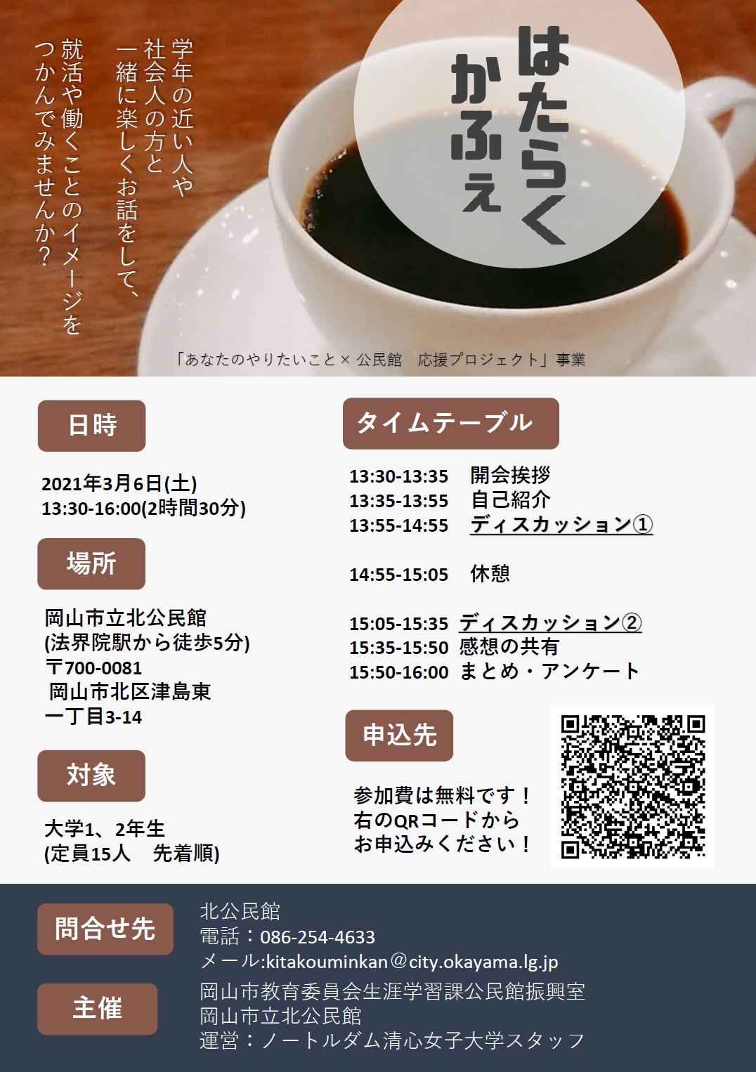 最後に、私は次回3月6日(土)にもう一度『はたらくかふぇ』を実施します。ぜひ多くの大学1,2年生の方に参加していただきたいと思っているので、興味のある方はご参加ください(下記チラシをご参照ください)。よろしくお願いいたします。
