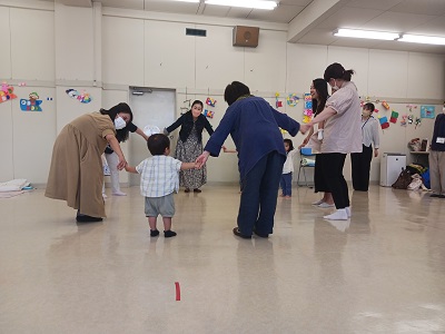 今回は、授業でもお世話になっているわらべうた講師の吉村玲子先生においでいただき、わらべうたでたっぷり遊び、大人も子どもも楽しい時間を過ごしました。