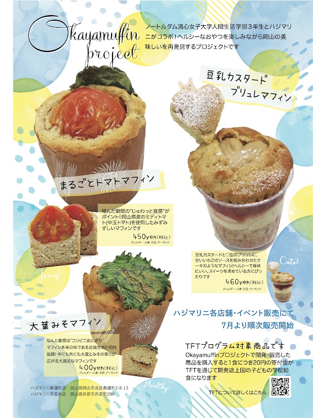人間生活学科豊田ゼミ生が、6月30日に表町商店街で開催された「OKAYAMAつながる市」でハジマリニさんのマフィン・スコーン・ドーナツを販売しました! 雨の中にもかかわらず、「OKAYAMAつながる市」にご来場してくださったみなさん、ありがとうございます!