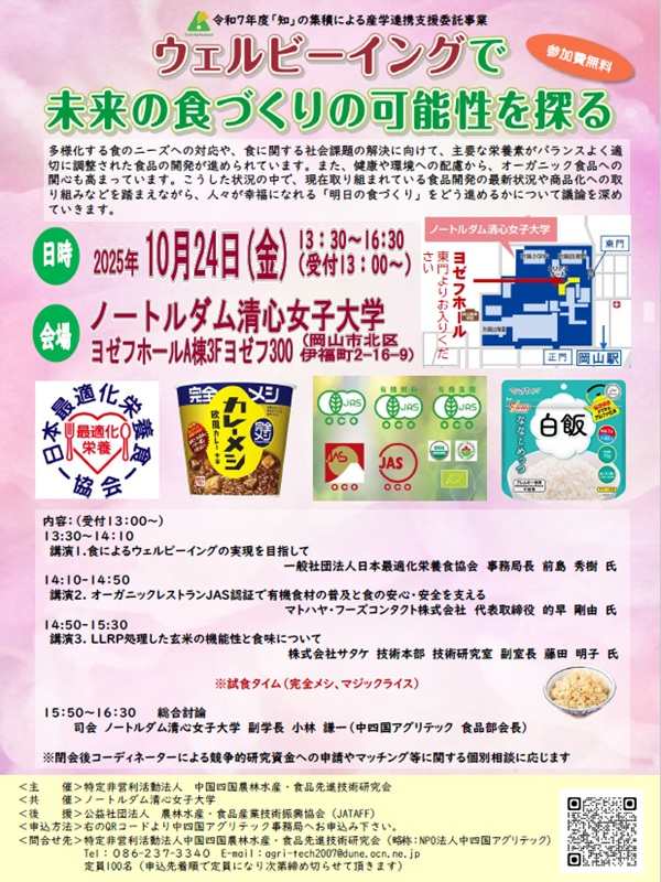10月24日(金)に特定非営利活動法人 中国四国農林水産・食品先進技術研究会(中四国アグリテック)主催の食品部会セミナー「ウェルビーイングで未来の食づくりの可能性を探る」が開催されます。食品栄養学科の小林謙一教授が司会を務めます。
