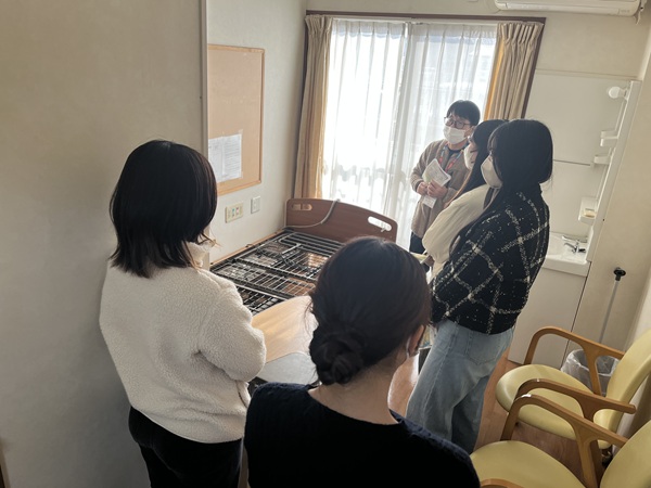 見学では、副施設長の中山さんに案内していただきながら施設の理念や歴史、具体的な支援内容について学ぶことができました。施設は約80名が入所できる比較的大規模な建物であり、季節が12月だったこともあり、施設の至るところにクリスマスツリーや飾りつけが施されていました。単に生活の場としての機能だけでなく、季節感や楽しさを日々の暮らしの中に取り入れ、利用者が「ここで生活することの心地よさ」を感じられるような工夫が随所に見られました。