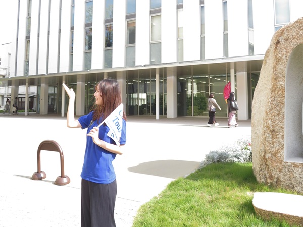 ツアーでは、私たち在学生だからこそ伝えられる「大学生活の様子」に重きを置いてキャンパス内を案内しました。ツアーの参加者は高校生だけでなく、在学生やその保護者、OGの方など様々。オープンキャンパスではあらかじめ設定されたルートで案内することが多いのですが、今回は参加者一人ひとりの要望に合わせたツアーを行いました。