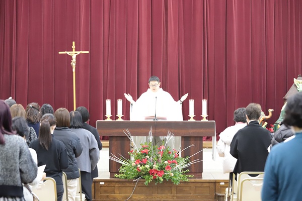 ミサは厳かで温かな雰囲気の中で進められ、会場いっぱいに集まった学生や教職員、関係者の方々とともに祈り、聖書の朗読や神父様のお話に耳を傾けました。