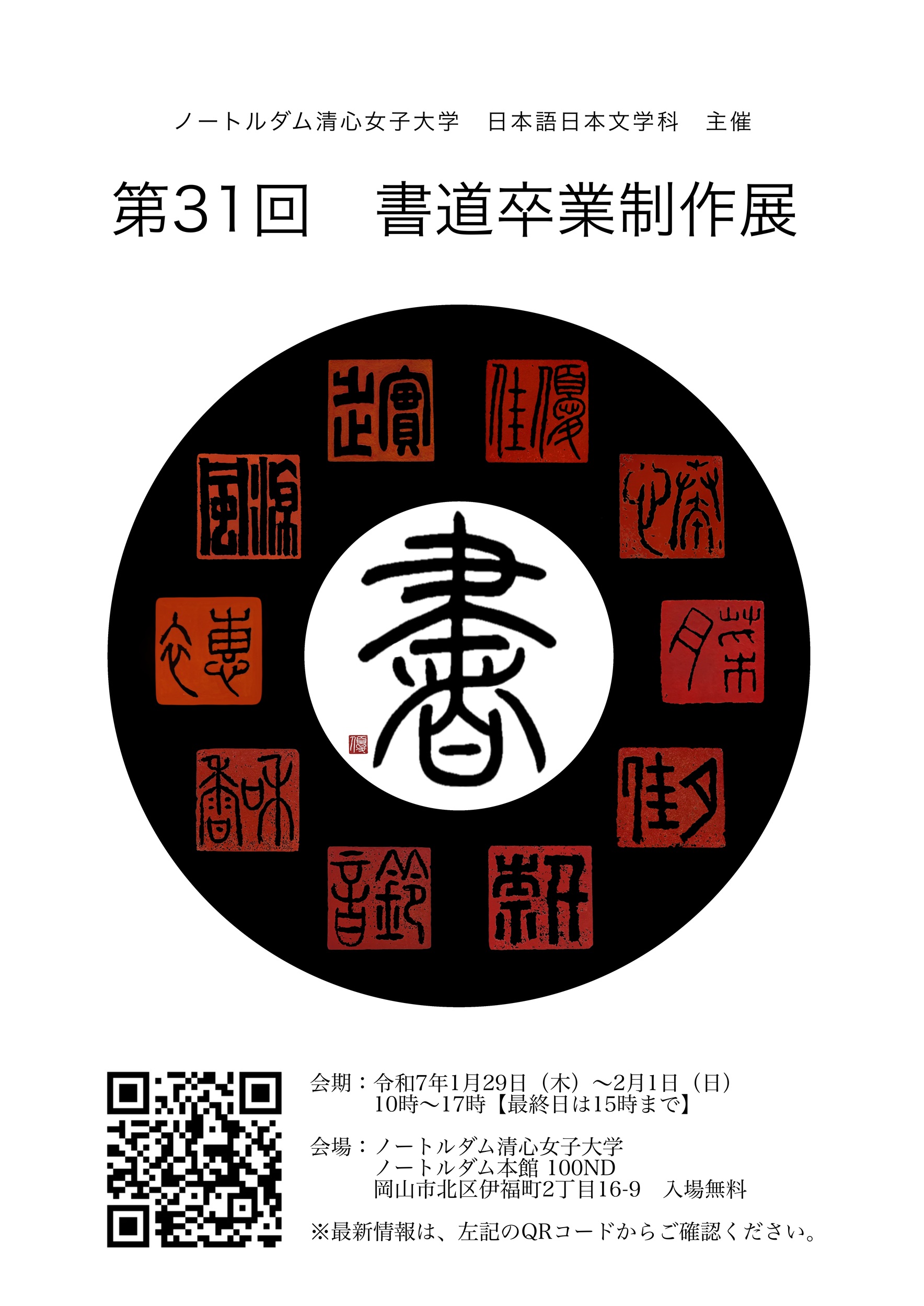 ノートルダム清心女子大学日本語日本文学科では、「書道卒業制作」の授業において、書の学びの集大成として「書道卒業制作展」を開催します。