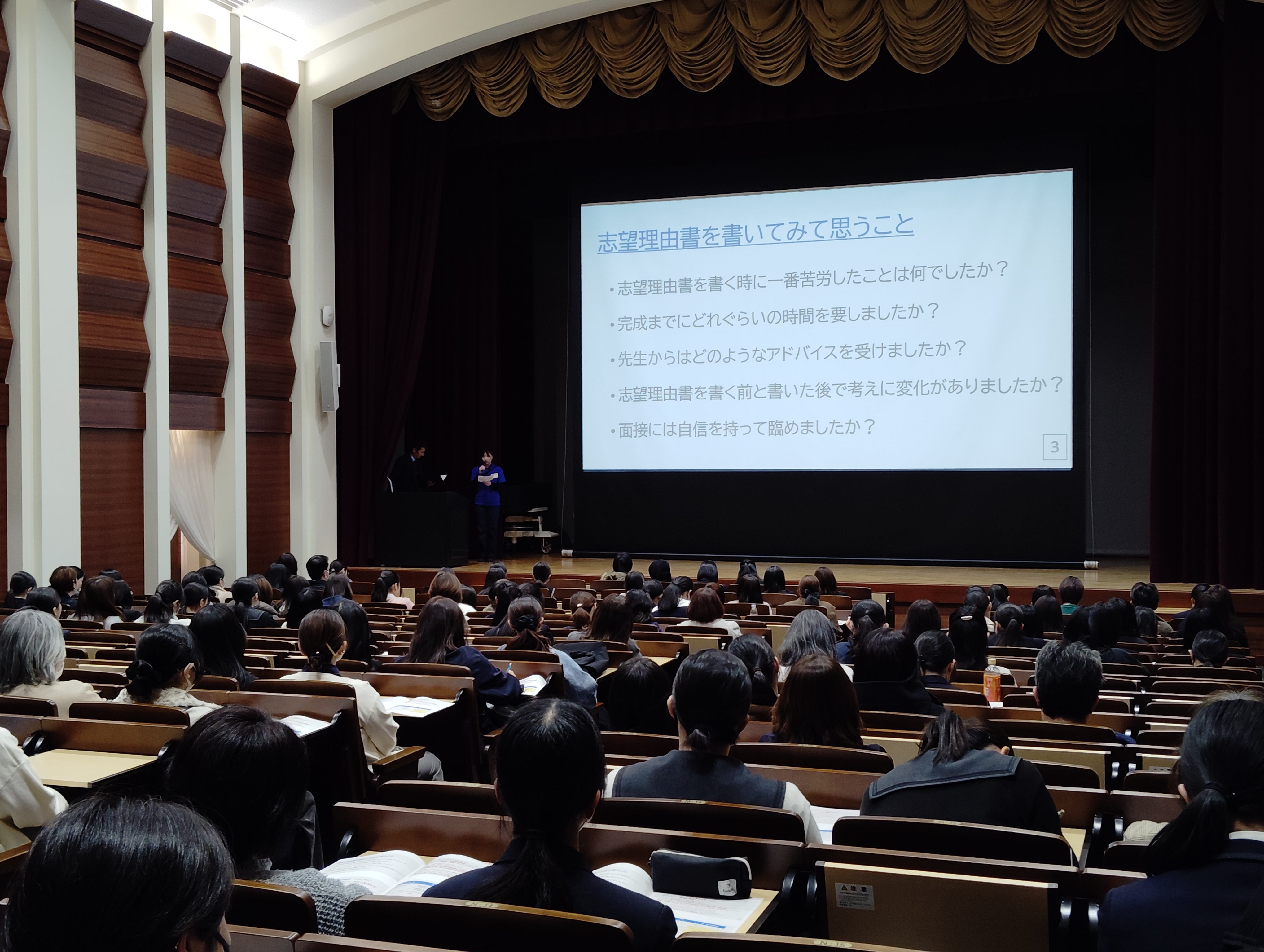 志望理由書を書く際に大切なポイントを、在学生の受験時の体験談を交えながら説明しました。志望理由書を書き始める上で大切なことは、頭の中だけで考えず、とにかく書き出して整理することです。また、結果や成果のみを書くのではなく、どのように努力したのか、どのように成長できたのかなど、具体的な過程を書くことが大切だという話もありました。