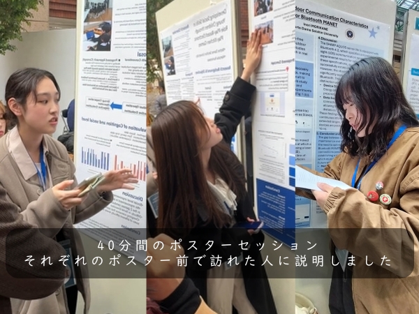 本学からは、情報デザイン学科の学部2年生5名がそれぞれ、無線通信技術の実環境評価に関する研究2件と、幼児の行動・社会性のデータ主体の客観的取扱いに関する研究3件の計5件を発表しました。