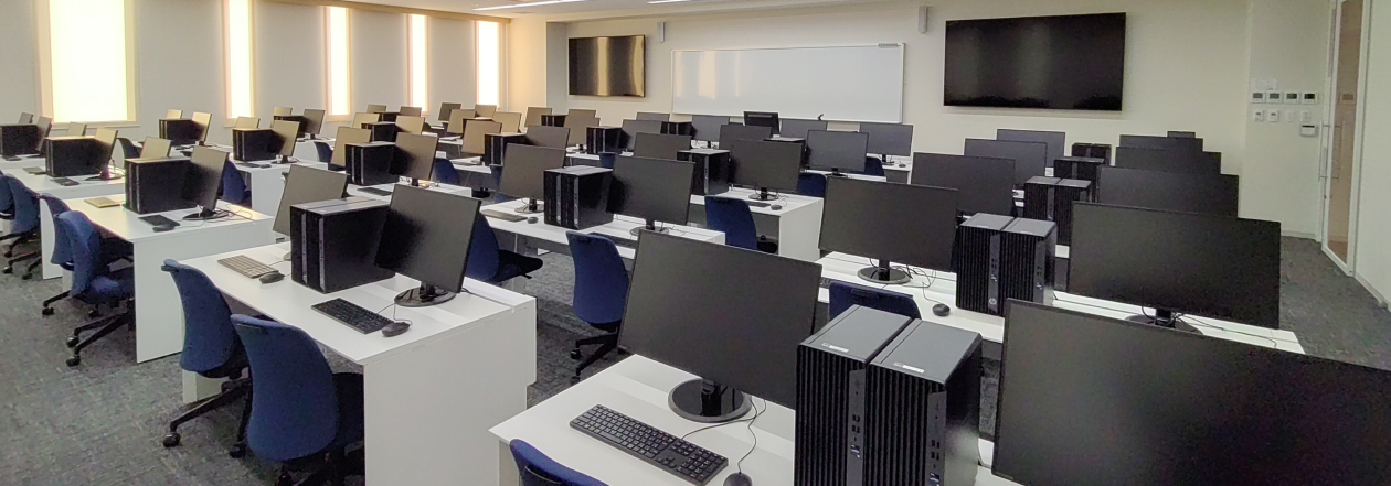 The new Trinity Hall facility has a space dedicated to The Faculty of Data Science that is equipped with the latest equipment necessary for learning in the Department. The PC classroom is equipped with 27-inch computers on each desk as well as a 100-inch large display at the front of the room. Also, in addition to the PC classroom, there is also an exercise room, laboratory and workshop. The workshop has 3D printers and laser cutters installed. While moving freely between the dedicated lounge space, exercise room, workshop and other areas during classes, students will interact with faculty and other students as they broaden their learning opportunities.