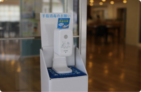 学内45か所に自動式の「泡手指消毒剤」を設置しています。設置個所は多くの学生が使用する大教室及び学生・ 教職員 ・ 外来者など人流の多い箇所の出入口です。これまで手押しポンプ式を設置していた場所も自動式に変更しました。体温検知システムも各所に配置しています。