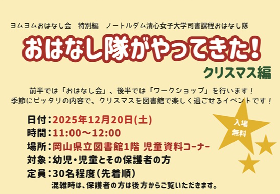 12/20 岡山県立図書館にて「おはなし隊がやってきた!クリスマス編」を開催します|司書課程おはなし隊