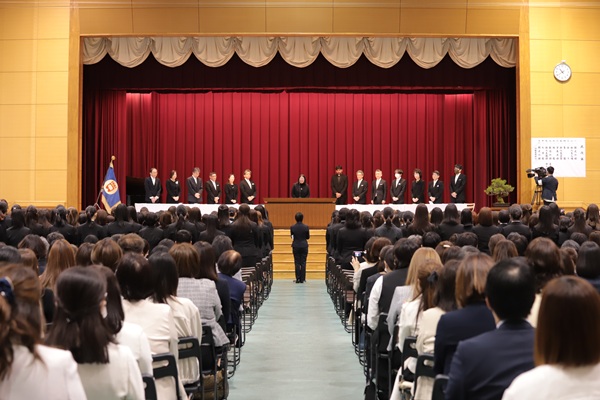 式典では、創立期にシスターたちがベートーベン作曲の勇壮な曲に詞をのせて作った大学歌、そして設立母体ナミュール・ノートルダム修道会の創立者聖ジュリー・ビリアートの信条「よき神ぞよけれ」を謳える聖歌「サンタ・ユリア導き給え」が歌われます。建学の精神、宣誓文、大学歌、聖歌――これらすべてが「心を清くし、愛をもって真理を探究する」という一つの理念を異なる言葉で唱えており、式典全体がその理念の体現となっています。