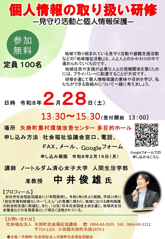 2026年2月28日(土)に、矢掛町農村環境改善センターにて開催される「個人情報の取り扱い研修 ー見守り活動と個人情報保護ー」で、人間生活学科 中井俊雄准教授が講師を務めます。ぜひご参加ください。