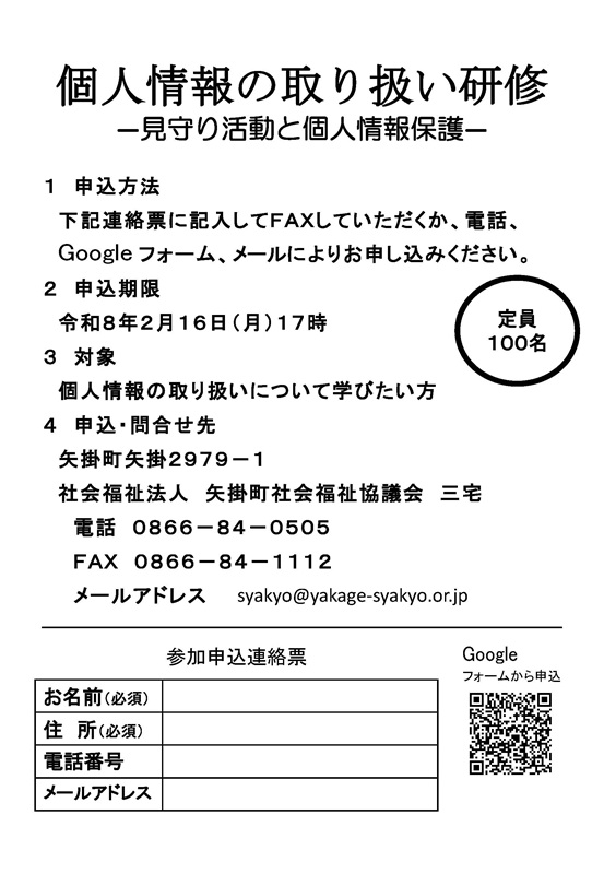 備考:100名(申込は矢掛町福祉協議会窓口、電話、FAX、メール、Googleフォーム)、参加無料