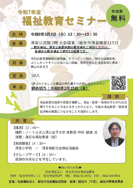 2026年3月3日(火)、清音福祉センターにて開催される、『令和7年度 福祉教育セミナー』で「身近な福祉教育」と題し、人間生活学科 中井俊雄准教授が講演いたします。ぜひご来場ください。