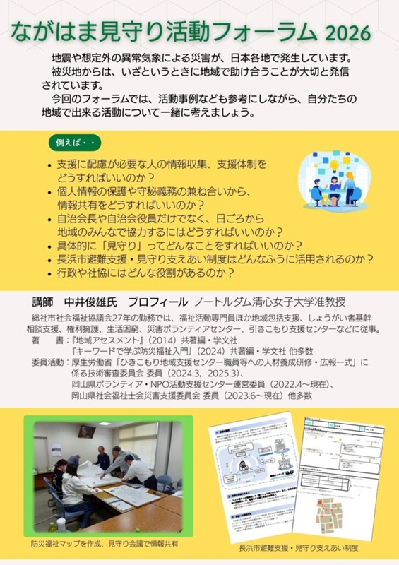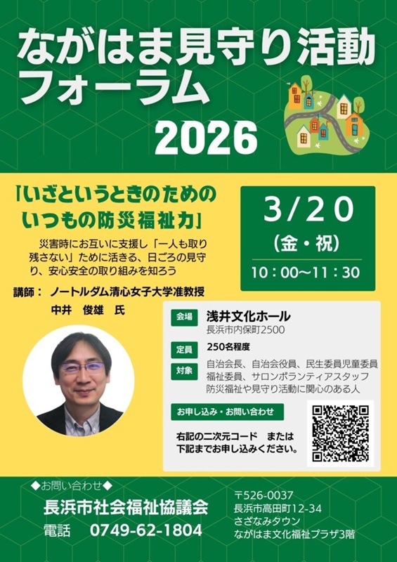 2026年3月20日(金・祝)に、浅井文化ホールで開催される『ながはま見守り活動フォーラム2026』にて「いざというときのためのいつもの防災福祉力」の講師を人間生活学科 中井俊雄准教授が務めます。ぜひご参加ください。