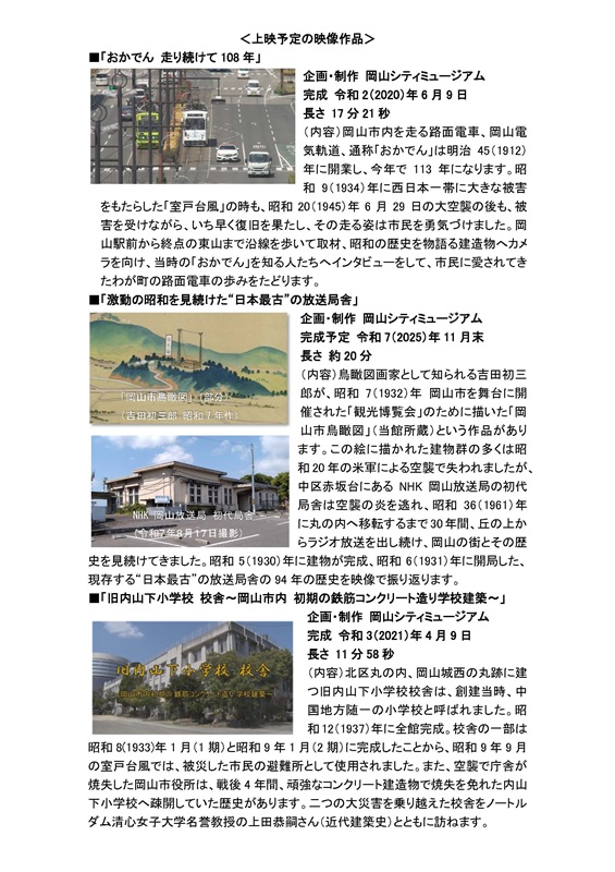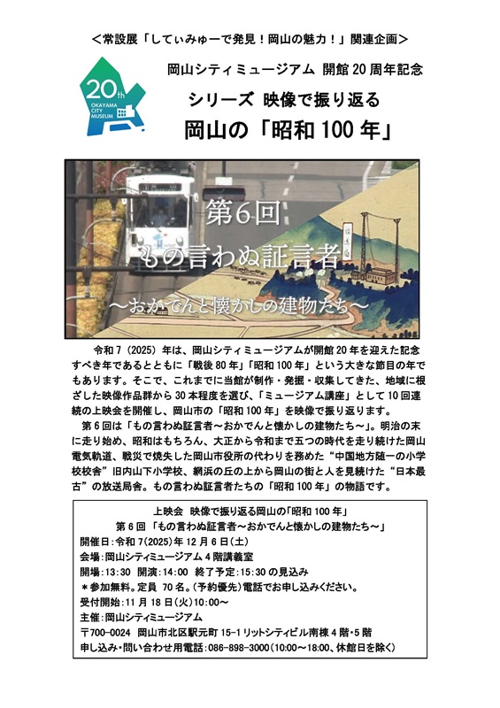 2025年12月6日(土)、岡山シティミュージアムで開催される上映会『映像で振り返る岡山の「昭和100年」第6回もの言わぬ証言者-おかでんと懐かしの建物たち-』で、上田恭嗣名誉教授が出演する「旧内山下小学校校舎-岡山市内 初期の鉄筋コンクリート造り学校建築-」が上映されます。ぜひご来場ください。