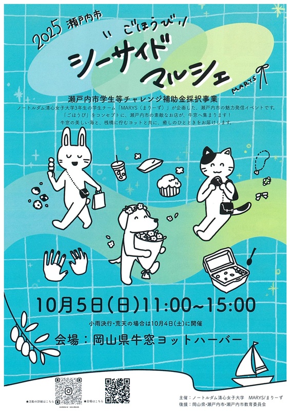 2025年10月5日(日)に、岡山県牛窓ヨットハーバーにて、人間生活学科経営経済学コース3年生の学生たちで構成されるゼミ「MARYS」がごほうびシーサイドマルシェを主催します。